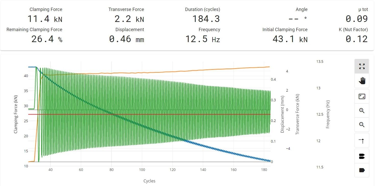 リアルタイムで軸力(kN)vs振動負荷回数(cycle)の減衰カーブと、振動数、横変位量グラフ、グラフ域の上部の7コックピッド部に、リアルタイムで現在の軸力(kN)、剪断力(kN)、振動負荷回数、μtot、軸力の残存パーセンテージ(%)、横変位量(振幅*1/2)mm、振動数Hz、負荷振動数(cycle)、初期負荷軸力(kN)、Kナットファクターが数値で表示されます。